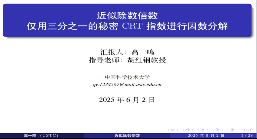 报告题目:近似除数倍数-仅用三分之一的秘密CRT指数进行因数分解