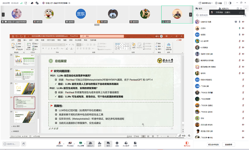 2025年6月2日14:00-17:30,示范班第123期方班学术研讨厅以线上形式成功举办。方滨兴老师、李晓明老师、王小云老师、周万雷老师、徐贯东老师、黄世忠老师全程参与了课堂教学,并对示范班同学们的报告逐一进行了指导。同时参与的还有方班研讨厅六个班级的副点评老师,以及来自广州大学、北京大学、北京理工大学、北京航空航天大学、天津大学、复旦大学、上海交通大学、东南大学、南京邮电大学、中国科学技术大学、湖南大学、四川大学、西安电子科技大学、武汉大学、南京理工大学、海南大学、山东大学、南开大学、西北工业大学、澳门城市大学、香港大学、香港科技大学、香港科技大学(广州)、香港理工大学、清华大学、吉林大学、浙江大学、重庆大学、中南大学、电子科技大学、华中科技大学、北京信息科技大学、华南理工大学、西安交通大学、厦门大学、同济大学、大连理工大学等三十余所高校院所的全体学生和部分老师,共计510余人。