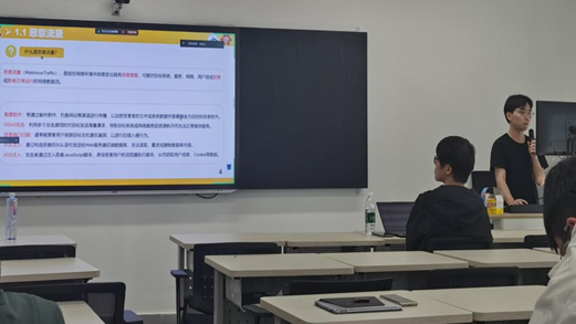 本次演武堂课程分为六个教学班。绿盟班(1班)汇报的同学是宋艺萌、陈旭东、杨渡翔,来自绿盟科技的袁军、卜天、张云海为主点评老师;海康班(2班)的汇报同学是曹振兴、曹焯楷、马汉松,来自海康威视的李超豪、闫皓楠为主点评老师;天融信班(3班)汇报的同学是罗文森、陈胤均、宋佳名,来自天融信的张凤羽、吴瑕、张朝潞为主点评老师;安天班(4班)的汇报同学是罗雨乔、邓文轩、黄海城,来自安天科技的张慧云为主点评老师;任子行班(5班)的汇报同学是李意、陈琅毓、陈悦雯,来自任子行的彭伙林、林亚坤、周邦链为主点评老师;启明星辰班(6班)的汇报同学是刘博宇、曾义,来自启明星辰的王硕玮、王星凯为主点评老师。