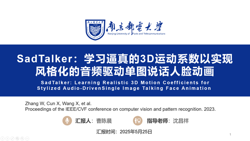 报告题目:SadTalker:学习逼真3D运动系数以实现风格化的音频驱动单图说话人脸动画